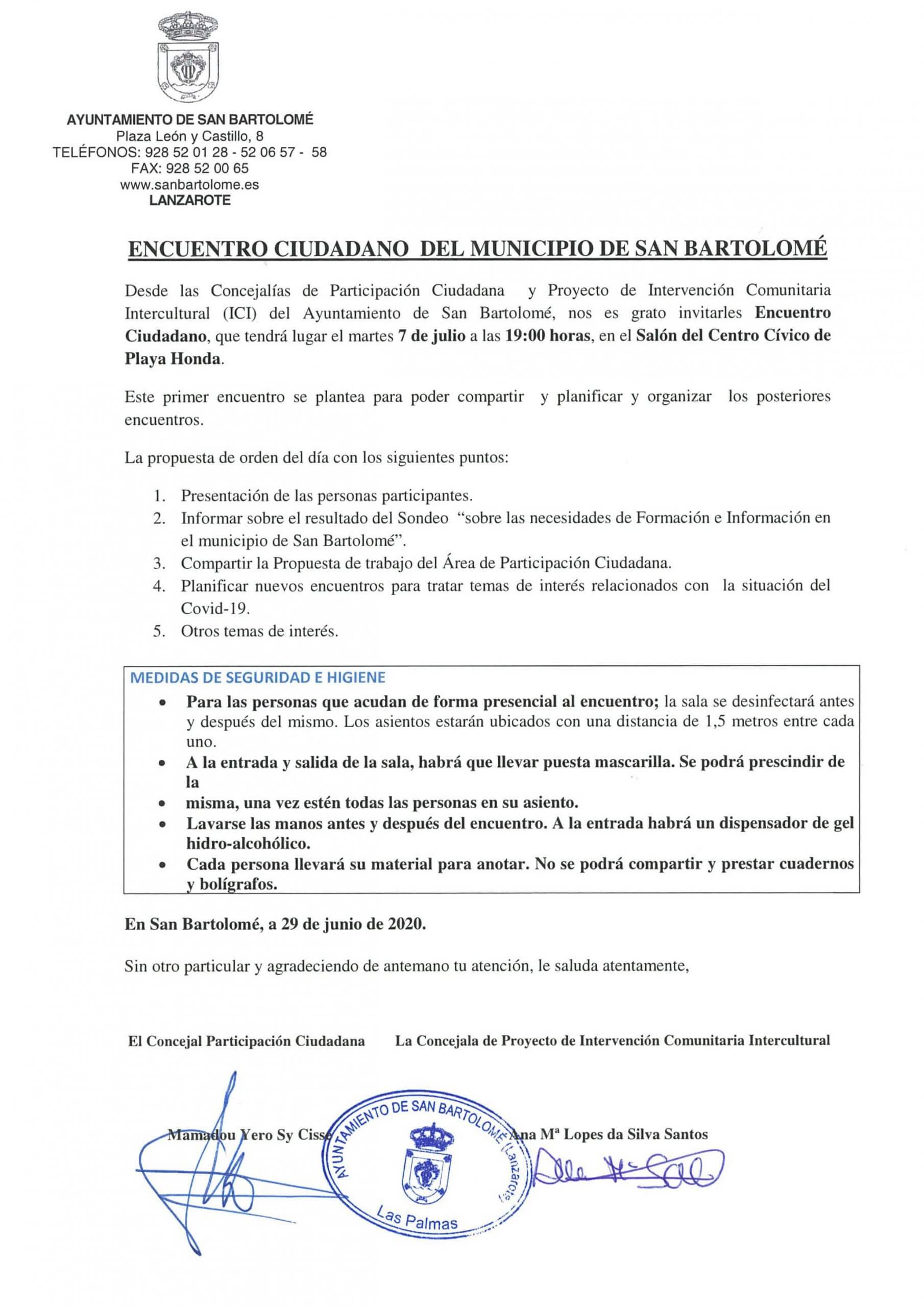 Encuentro Ciudadano con los colectivos municipales el martes, día 7 de julio a las 19:00 horas, en el Salón del Centro Cívico de Playa Honda. ¡Participa!