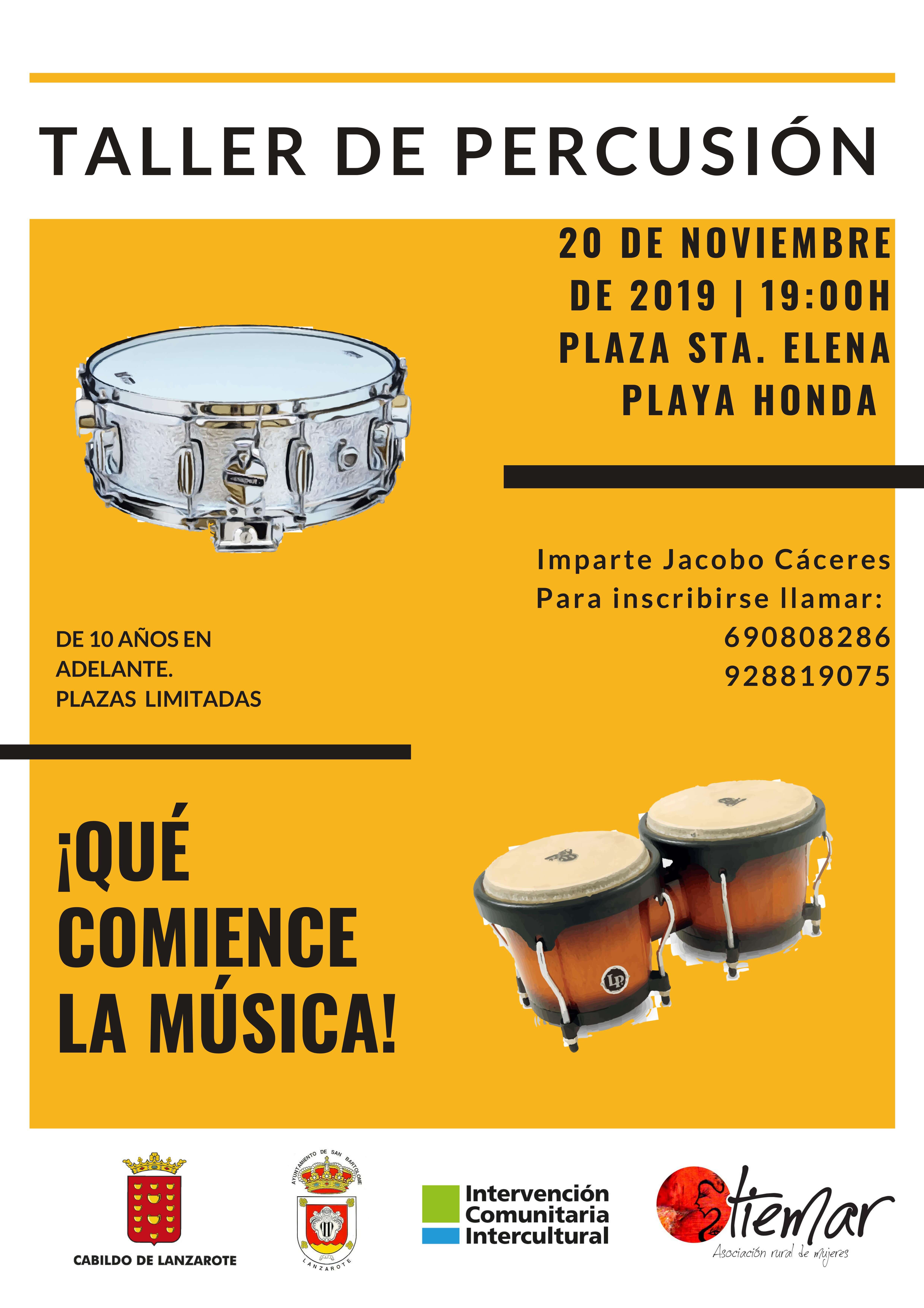 Taller de percusión en la Plaza Santa Elena a partir del 20 de noviembre. Inscripciones llamando al 690 80 82 86 o 928 81 90 75