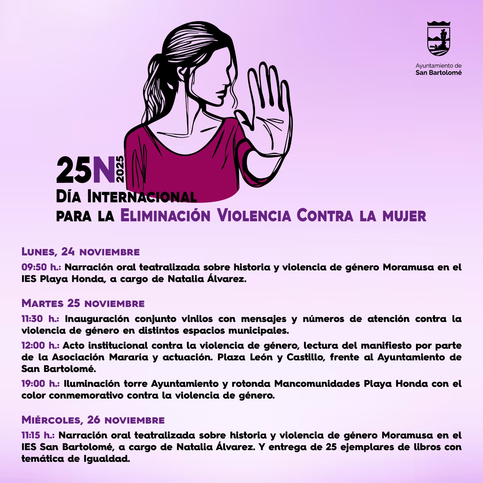 El Ayuntamiento de San Bartolomé organiza una programación especial para conmemorar el 25N y visibilizar la lucha contra la violencia de género