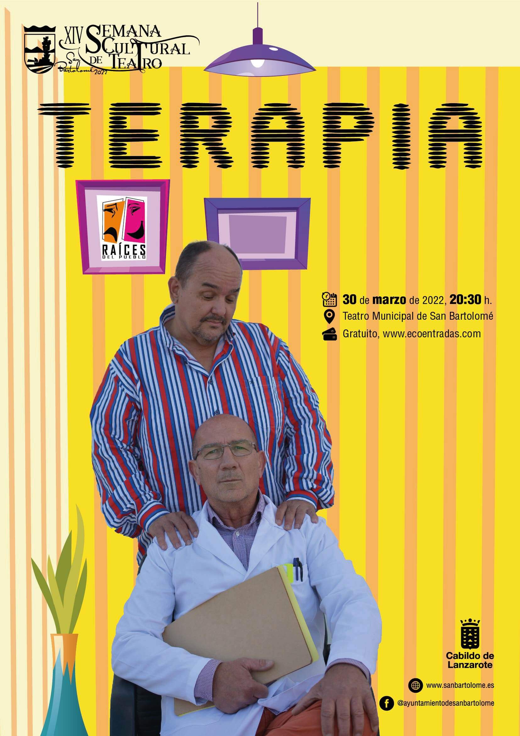30 DE MARZO DE 2022. 20:30H. 14º Semana Cultural de Teatro de San Bartolomé. Actividad: Representación de TERAPIA, a cargo…