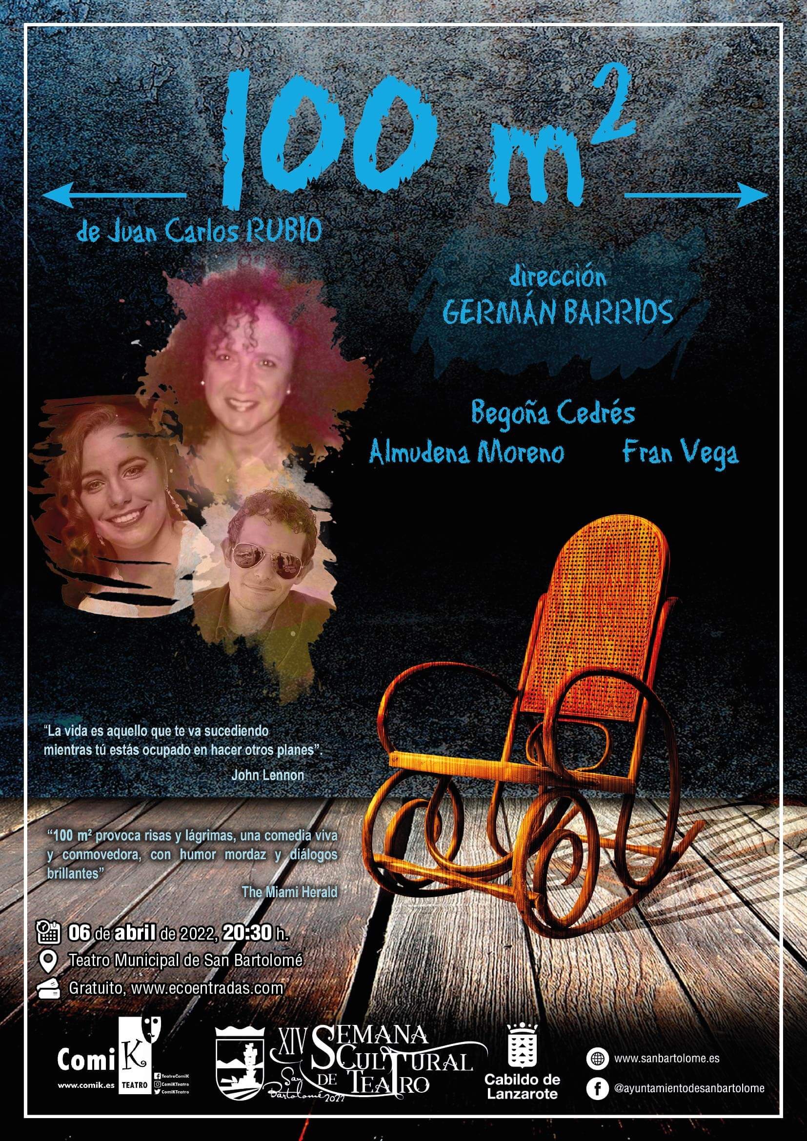 6 DE ABRIL DE 2022. 20:30H. 14º Semana Cultural de Teatro de San Bartolomé. Actividad: Representación de 100 M2, a…