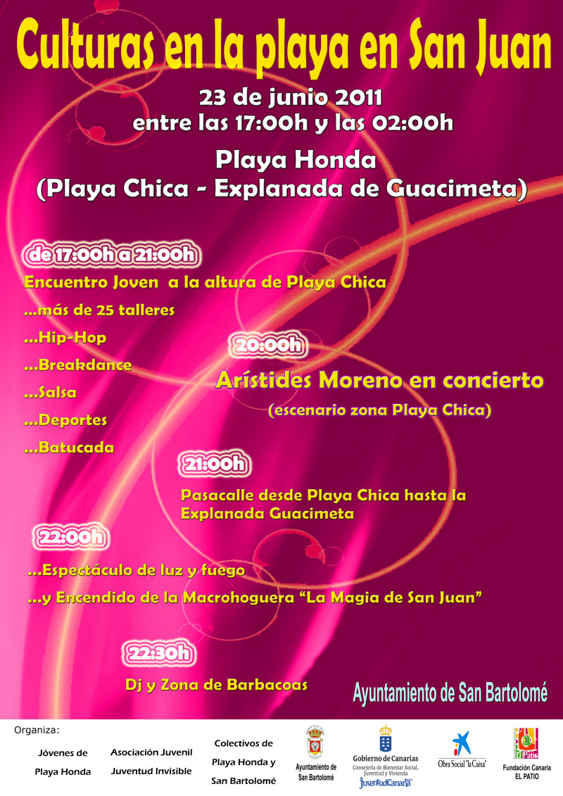 Encuentro joven con una veintena de talleres, actuación de Arístides Moreno, pasacalle, hoguera y música, actos centrales de la tarde y noche de San Juan en Playa Honda.