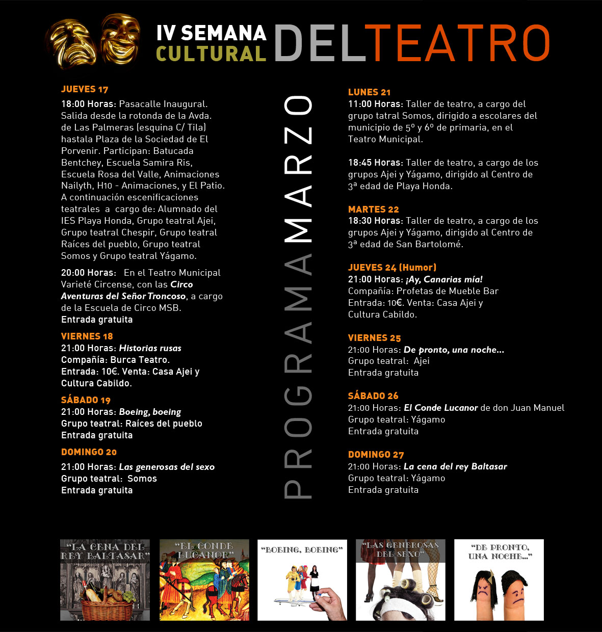 El miércoles día 16 de marzo a las 11.00 horas en el salón de plenos del Ayuntamiento de San Bartolomé, rueda de prensa para presentar a los medios de comunicación la IV SEMANA CULTURAL DEL TEATRO DE SAN BARTOLOMÉ 2011, que se desarrollará entre los días 17 y 27 de marzo, para conmemorar el Día Mundial del Teatro.