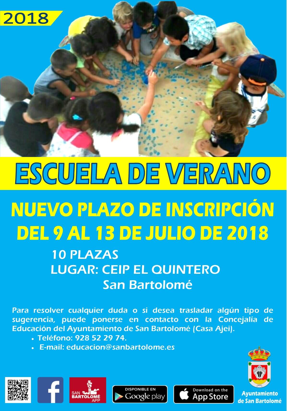 Una vez comenzado el servicio y visto que en la Escuela de Verano de San Bartolomé (C.E.I.P. El Quintero) quedan 10 plazas vacantes, se abre un nuevo plazo de inscripción que comprende entre el día 9 de julio y el día 13 de julio de 2018 (ambos inclusive). Se atenderán las solicitudes por riguroso orden de entrada en el registro del Ayuntamiento, hasta completar dichas plazas.