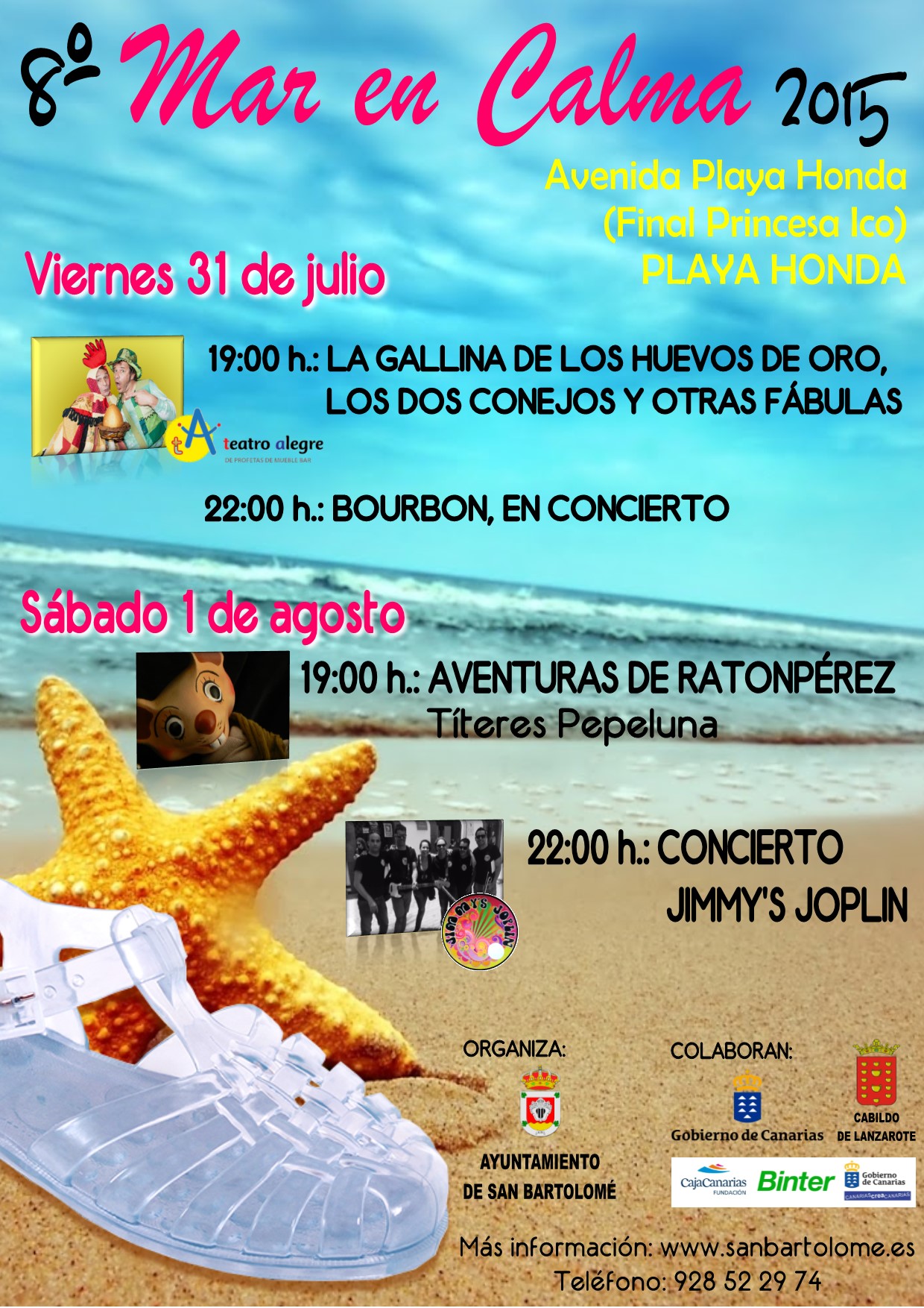 Tendrá lugar los días 31 de julio y 1 de agosto respectivamente en la Avenida de Playa Honda a la altura de la calle Princesa Ico, con un oferta de ocio cultural familiar, en la que tomarán protagonismo las actuaciones para todos los públicos, con teatro infantil y títeres de la mano de “Teatro Alegre” y “Títeres Pepeluna”, y las noches estarán llenas de buena música con dos atractivas ofertas con el ronroneo del mar de fondo “Bourbon” y “Jimmy´s Joplin”.