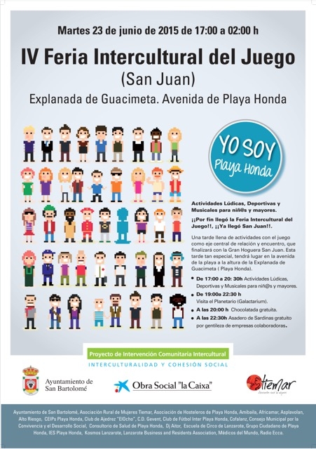 Playa Honda, 23 de junio de 2015. El próximo martes 23 de junio se celebrará en la Avenida de Playa Honda (Explanada de Guacimeta) la festividad de “San Juan” con el desarrollo de la IV Feria Intercultural del Juego, un encuentro intercultural e intergeneracional dirigido a vecinos y vecinas del municipio de San Bartolomé, preparado por diversos grupos y organizaciones ciudadanas de estos barrios.