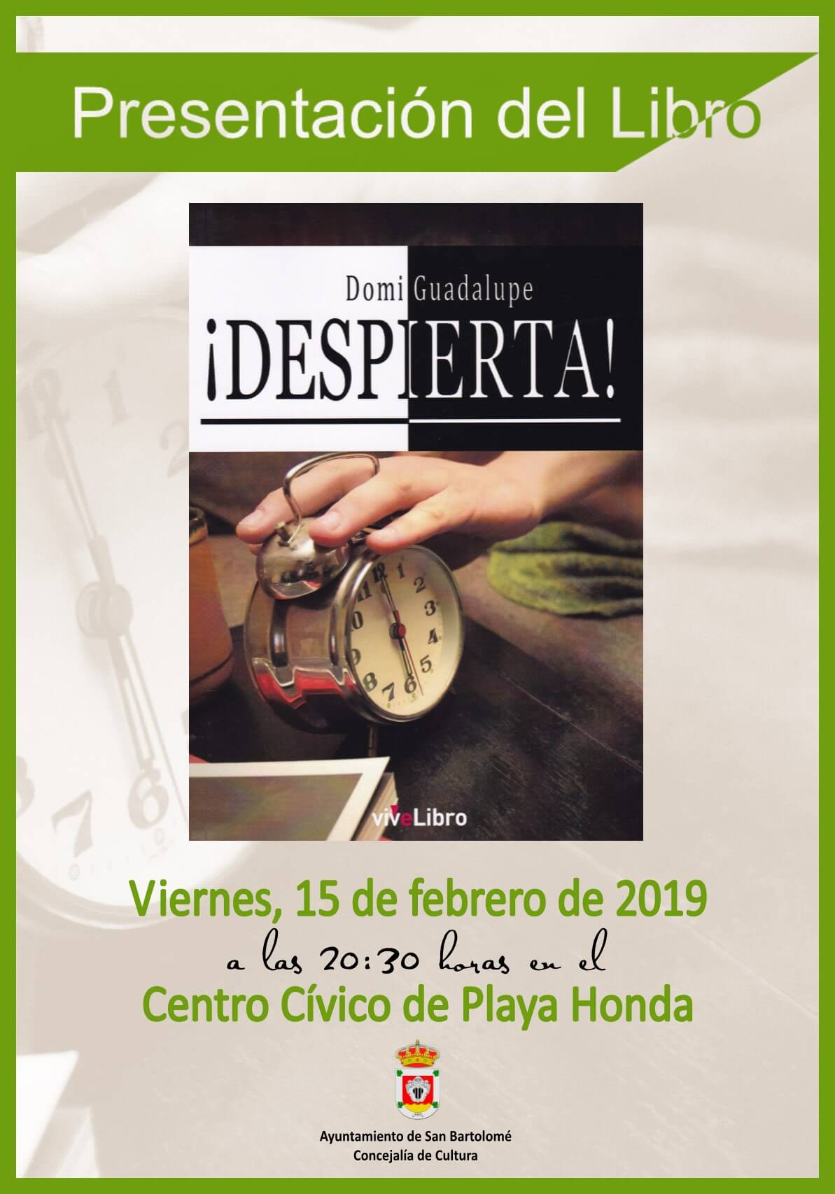 La alcaldesa, María Dolores Corujo, y la concejal de Cultura, Alma María González Mauri, invitan a toda la ciudadanía a la presentación de la tercera novela de Domi Guadalupe, este viernes, 15 de febrero en el Centro Cívico de Playa Honda, a las 20:30 horas.