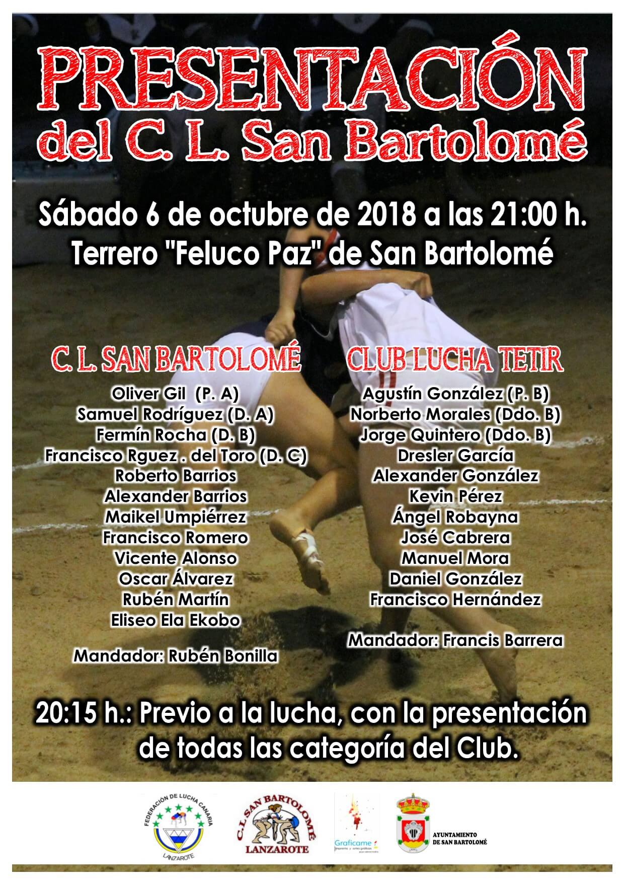 El sábado, 6 de octubre, presentación del C.L. San Bartolomé a las 20.15 horas, hora a la que empezará el desfile y presentación de todas las categorías del club, con posterior luchada que enfrentará a los luchadores del San Bartolomé, con los del Tetir.