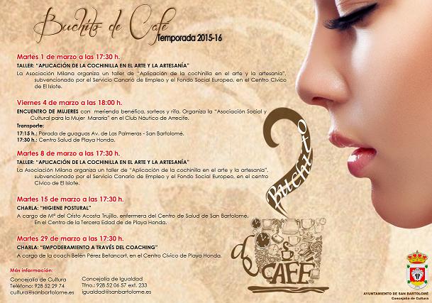 El Ayuntamiento de San Bartolomé a través de las  concejalías de cultura e igualdad, organiza varias actividades dentro del Servicio Municipal Buchito de café para el mes de marzo.