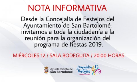 El Ayuntamiento de San Bartolomé invita a toda la ciudadanía a la reunión que se celebrará para organizar las Fiestas de San Bartolomé, y que tendrá lugar el miércoles, día 12 de junio, a las 20.00 horas, en la Bodeguita de la Casa Cerdeña.