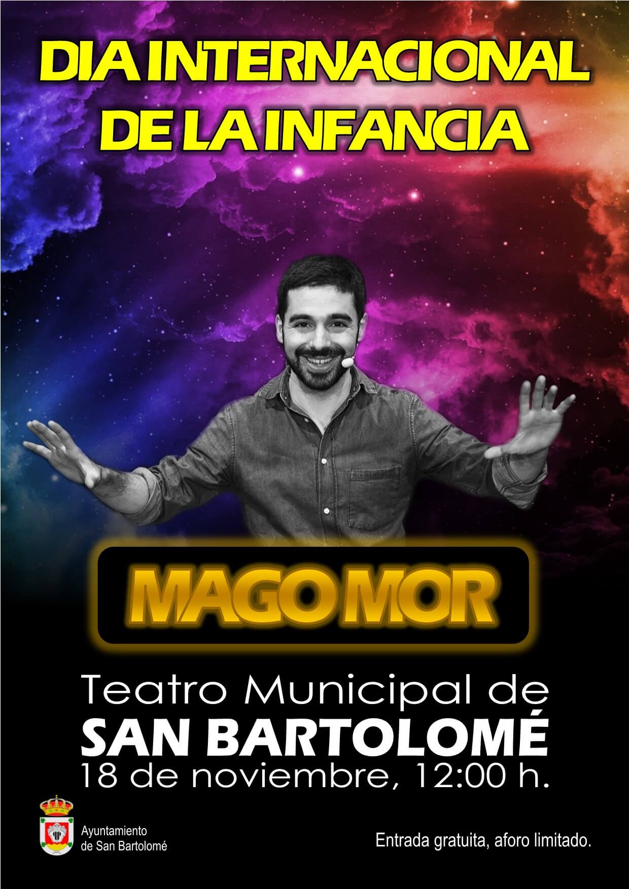 La concejalía de bienestar social propone una actividad lúdica para público familiar para conmemorar el Día Internacional de la Infancia en el municipio. Se celebrará con una actuación de magia a cargo del MagoMor, el domingo, día 18 de noviembre a las 12.00 horas, con entrada gratuita y aforo limitado.