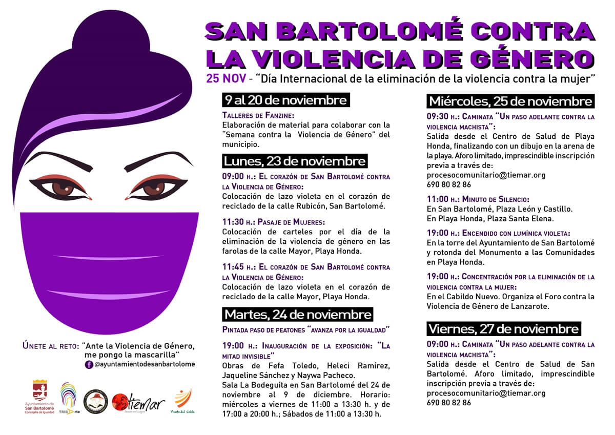 -9:00- Caminata “Un paso adelante contra la violencia machista”. Con salida en el centro de salud de San Bartolomé. Imprescindible inscripción previa a través de procesocomunitario@tiemar.org o llamando al 690 80 82 86.