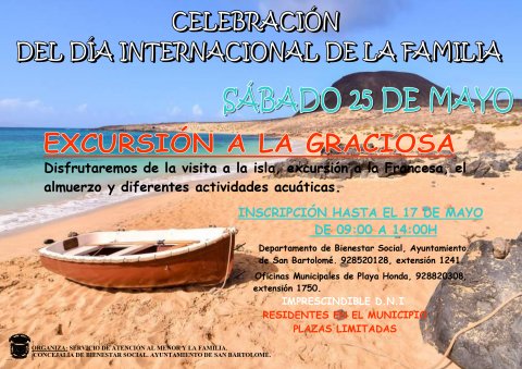 El Ayuntamiento de San Bartolomé con motivo de la conmemoración del Día Internacional de la Familia, informa a todas las familias del municipio, que tendrá lugar una excursión a la isla de La Graciosa, el sábado 25 de mayo, organizada a través del Servicio de Atención al Menor y la Familia del área de Bienestar Social.