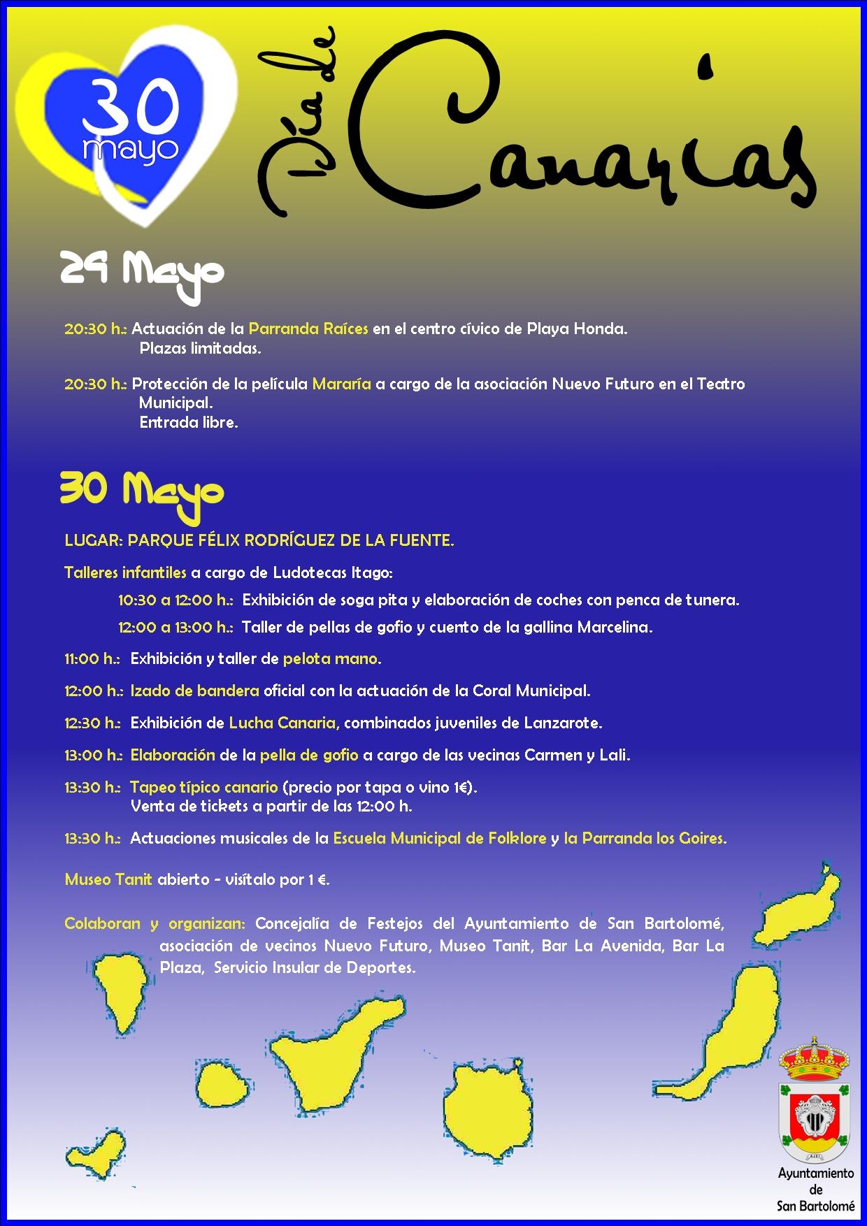 Los días 29 y 30 de mayo en el municipio de San Bartolomé se celebrarán diversos actos para conmemorar el Día de Canarias, centrándose en la víspera, el 29, día que se festejará en la localidad de Playa Honda, con actuación de la Parranda Raíces en el Centro Cívico de Playa Honda a las 20.30 horas, y a la misma hora proyección de la película Mararía en el Teatro Municipal.