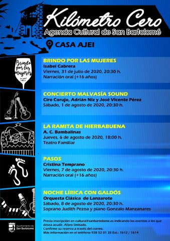 El Patio de la Casa Ajei albergará una combinación de píldoras culturales al aire libre, en la que se entremezclan varias disciplinas artísticas, contando con recursos locales e insulares, destacan el alcalde y concejal de cultura Isidro Pérez, y de ahí surge el nombre, de la apuesta por lo nuestro y cercano, invitando a toda la vecindad a participar en el ciclo de programación cultural presencial, Kilómetro Cero.