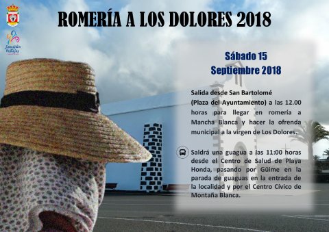 El Ayuntamiento de San Bartolomé invita a todos los vecinos/as del municipio a participar en la Romería a Los Dolores, el sábado, día 15 de septiembre, con salida desde San Bartolomé (plaza del Ayuntamiento) a las 12.00 horas para llegar en romería a Mancha Blanca y hacer la ofrenda municipal a la virgen de Los Dolores.