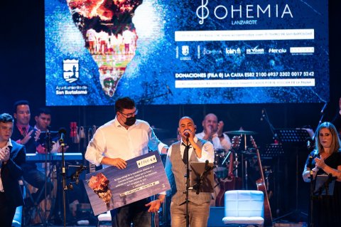 El concejal de Festejos, Isidro Pérez, recogió el talón de 1.820€ y agradeció las aportaciones y presencia en este escenario de Bohemia Lanzarote, y de todas las personas que han hecho posible este concierto aportando su granito de arena.