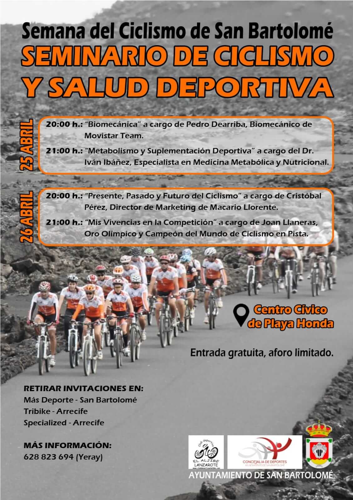 Para acudir a las Jornadas que son gratuitas y con aforo limitado, los interesados/as deberán retirar invitaciones previamente en los siguientes puntos: Mas Deporte San Bartolomé, Tribike Arrecife, Specialized Arrecife. Para ampliar información contactar con el teléfono 628 823 694 (Club de Ciclismo El Aljibe).