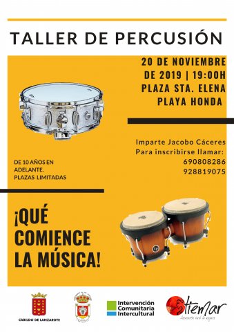 Informamos a niños/as (mayores de 10 años), jóvenes y mayores, que el 20 de noviembre a las 19.00 horas dará comienzo un taller de percusión en Playa Honda, Plaza Santa Elena, que impartirá Jacobo Cáceres, gratuito y con plazas limitadas.