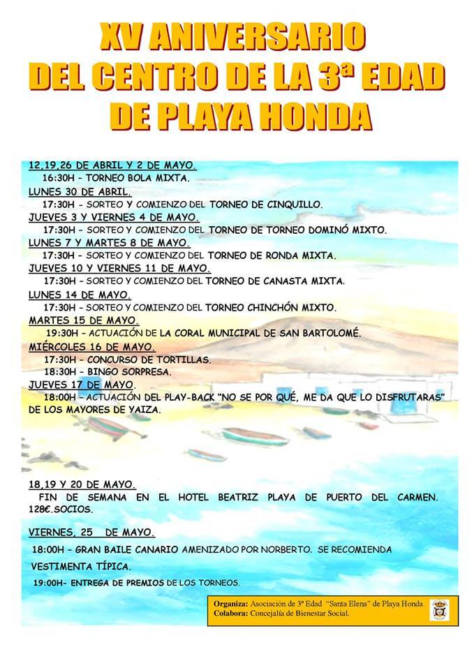 Como en cada edición numerosos actos forman este programa organizado por la Asociación de la Tercera Edad Santa Elena de Playa Honda, en el que los torneos de juegos de bola y juegos de mesa tienen gran protagonismo. Pero los mayores de Playa Honda también podrán disfrutar con la actuación de la Coral de San Bartolomé, podrán participar en un concurso tortillas, en el tradicional bingo sorpresa, con playback, o disfrutar de un fin de semana en un hotel con talasoterapia (128€ para socios/as) y baile canario.